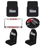 NFL New England Patriots 6 PC Auto Accessories Combo Kit - Rubber Floor Mats, Seat Covers, Steering Wheel Cover and Chrome License Plate Frame |